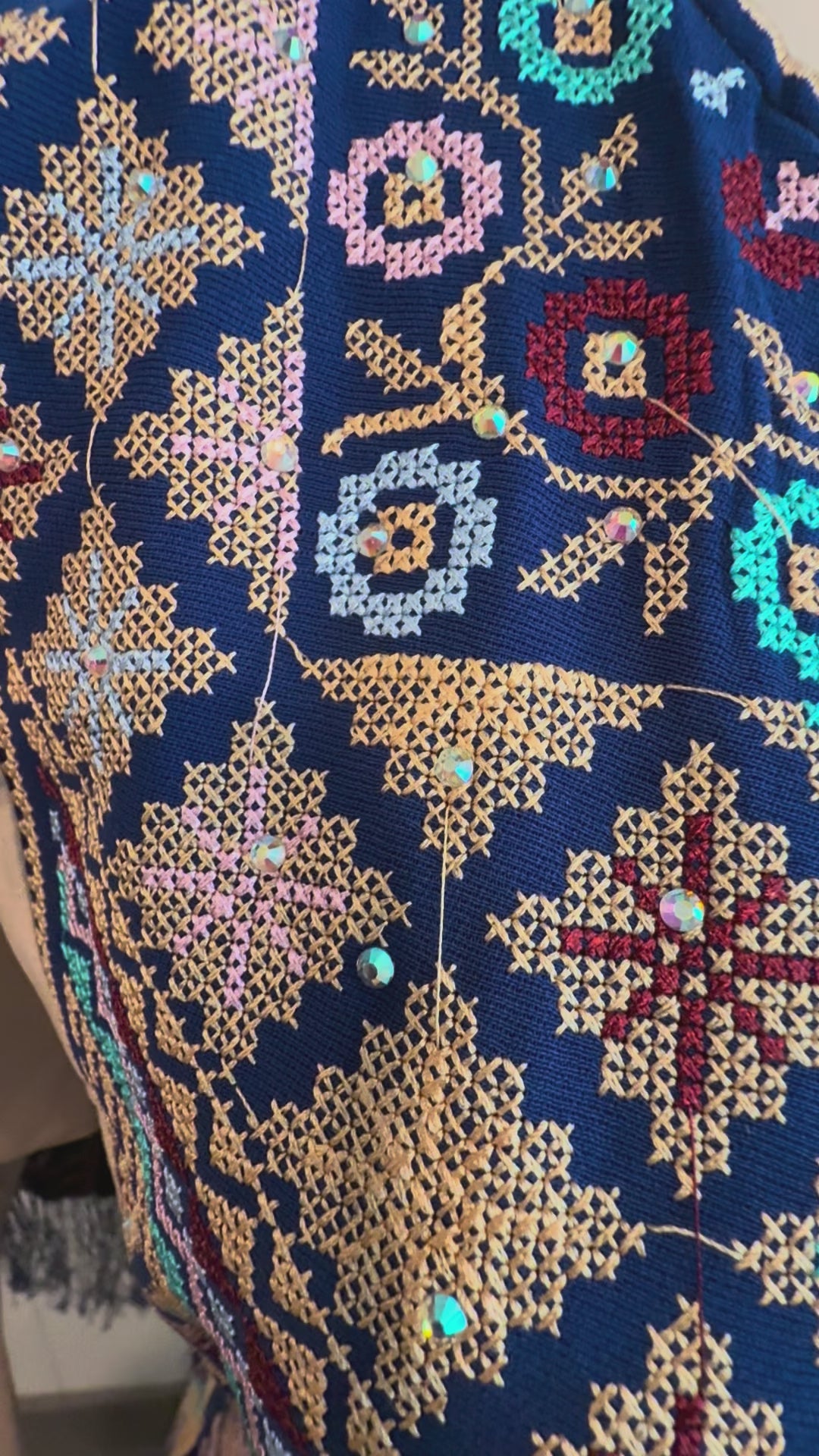 This heavily embroidered thobe is fully beaded with large satin bell sleeves. Included is a headpiece and a double sided belt one side with tatreez and a second side with gold satin that compliments the sleeves of the thobe.